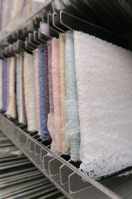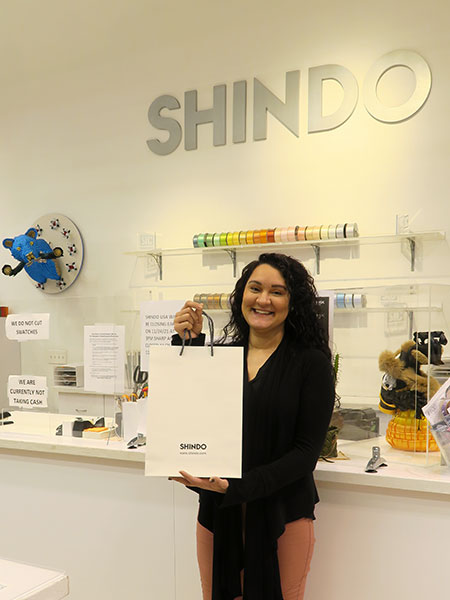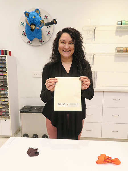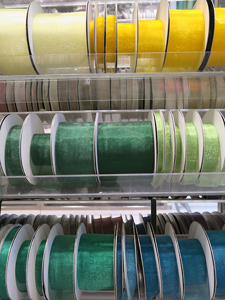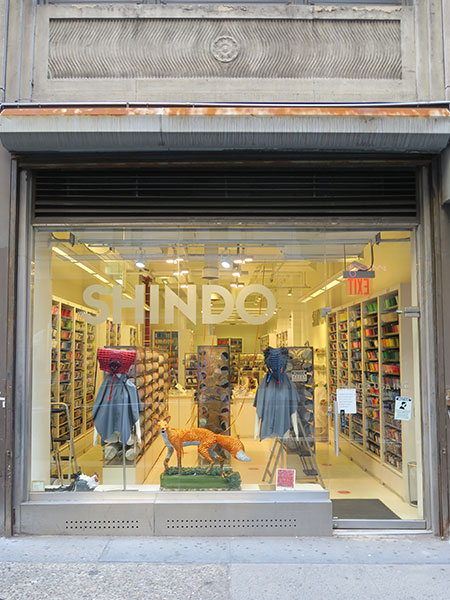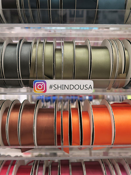 NYショールームからリポートです。越前和紙手提げ袋をお客様に配布していただきました。SHINDO USAはニューヨークのファッション産業が集積するガーメント・ディストリクトにあります。マンハッタンの中心に位置し、大手ファッションブランドのショールーム、企画室、また洋服の生地・素材のサプライヤー、小さな縫製室(ミニラボ)等が多くあります。SHINDOには、服飾副資材としてのリボン、ベルト、コード、ボタンホールを求めるデザイナーがひっきりなしに訪れます。また近くにはファッション工科大(FIT)などの専門大学もあることから、学校帰りに自分が仮縫いをしたサンプルを手にした学生が、それらに合うリボンを求めてやってきます。SHINDOのショールームにあるS.I.C.商品の種類は約700種類、各幅とカラー展開を合わせるとアイテムは4万点以上。日本の福井県あわら市にある石塚工場から毎週の頻度で空輸されてきます。ある女性アパレルブランドの男性デザイナーにお話を伺うと、マントを留める用途にグログランリボンを使用するとのこと。質感が高級であり、他の製品を使うとチープ(安く)に見えることから、SHINDOのリボン以外には考えられないと話されていました。