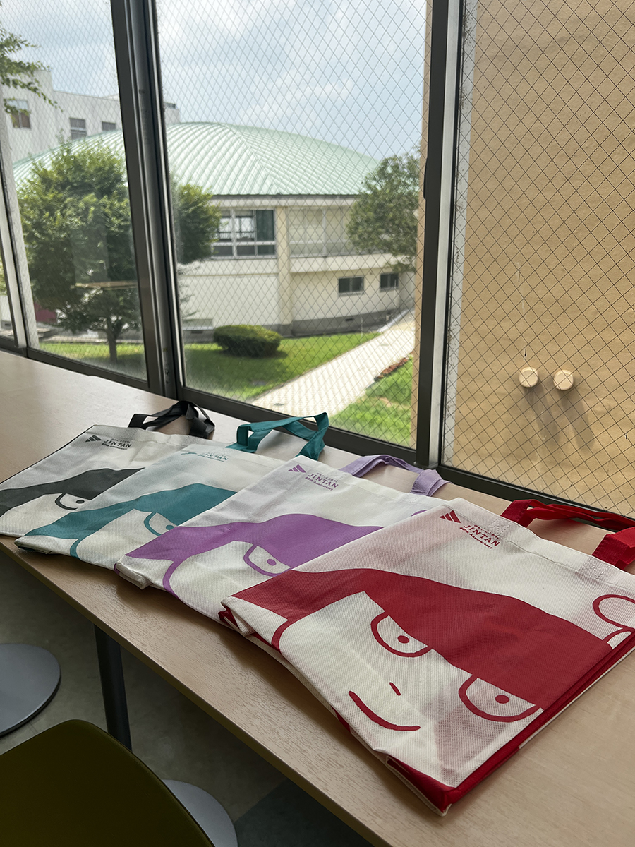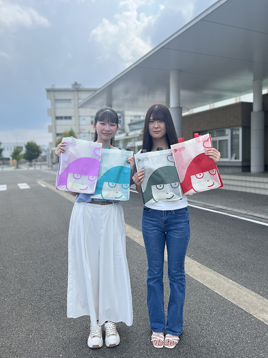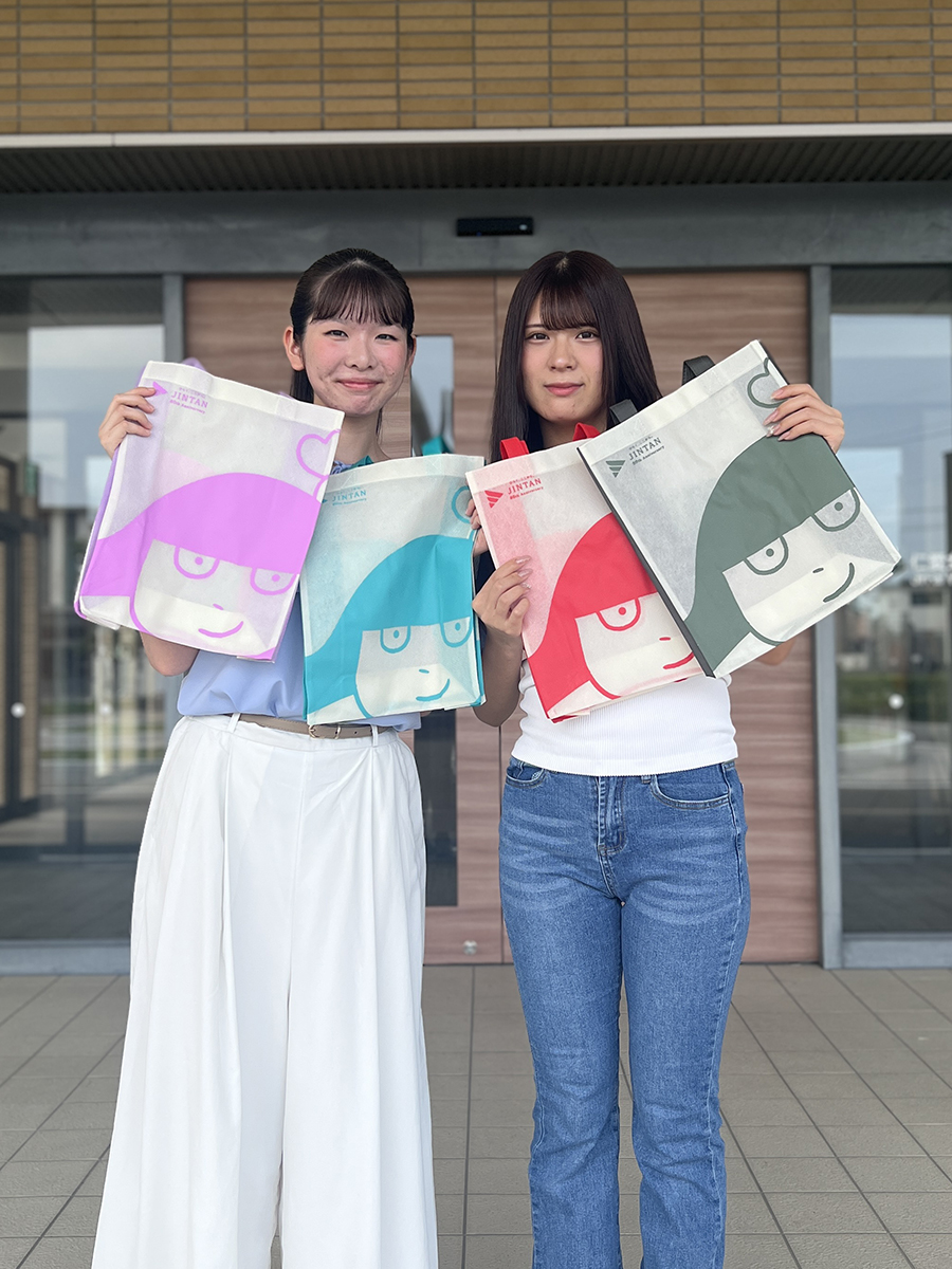 オープンキャンパス等のイベントで使用する不織布バッグですが、今年は60周年仕様で「あいたん」が大きくプリントされたデザインになりました!カラーが4色展開なのが可愛いポイントです。仁短生のお二人に協力してもらい、バッグを持って写真に写っていただきました。資料や荷物がたくさん入るサイズ感で、学校でも日常でも使いやすいバッグになっています。