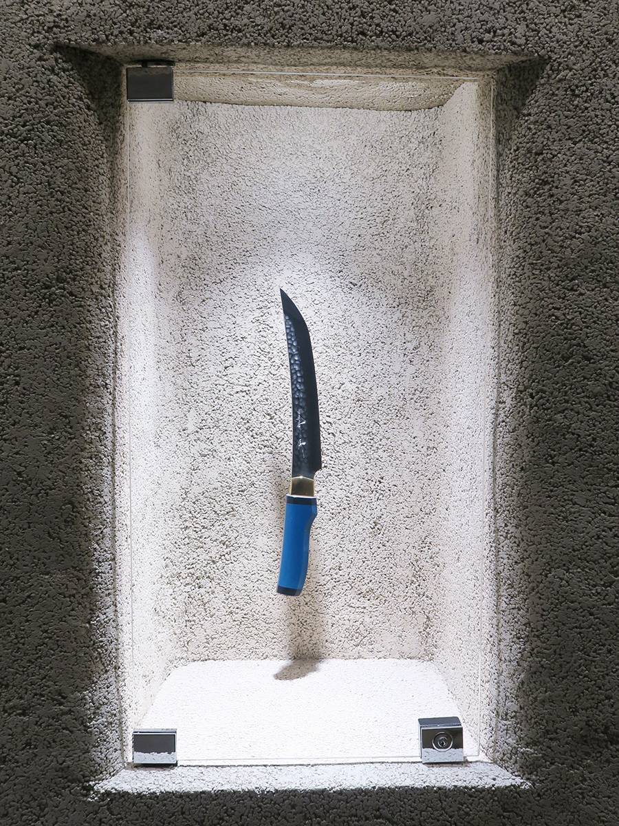 お店のメインフロア(2階)にある青い巨大絵画は、アーティスト寒川裕人/ユージーン・スタジオ様が福井の風景を見て描かれたものです。またバー・センティフォリアの駒井様の氷切り包丁などが飾られており(しかも包丁はどれも購入可能!)、お店はさながら美術館のようです。