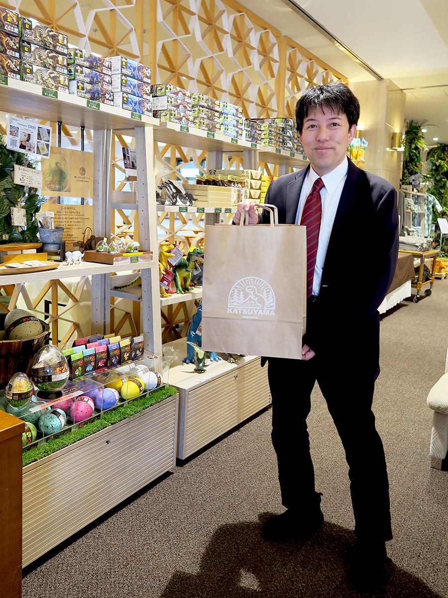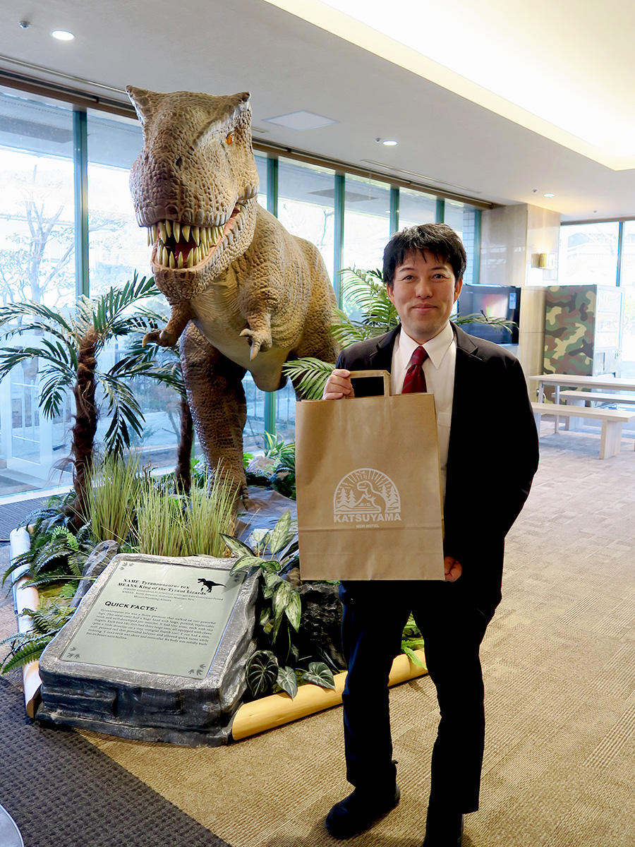 今回製作した紙袋は、売店でのお買い物用のほか、恐竜ルーム宿泊者向けの特典用としてご使用いただく予定です。楽しみにお越しください。
