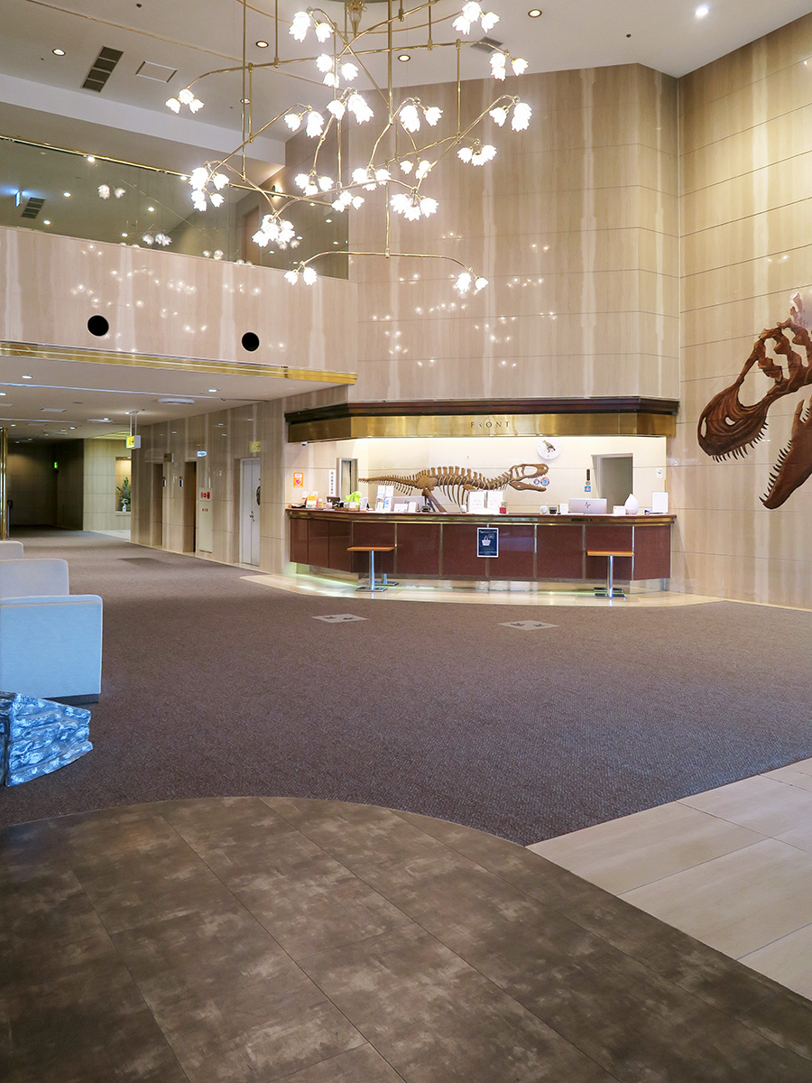 勝山ニューホテル様は、「恐竜のまち勝山」らしい雰囲気を楽しめるアミューズメントホテルです。ロビーに入ると迫力のある恐竜のお出迎えがあり、特別な気分を味わえます。館内の至るところに恐竜の装飾が施されています。