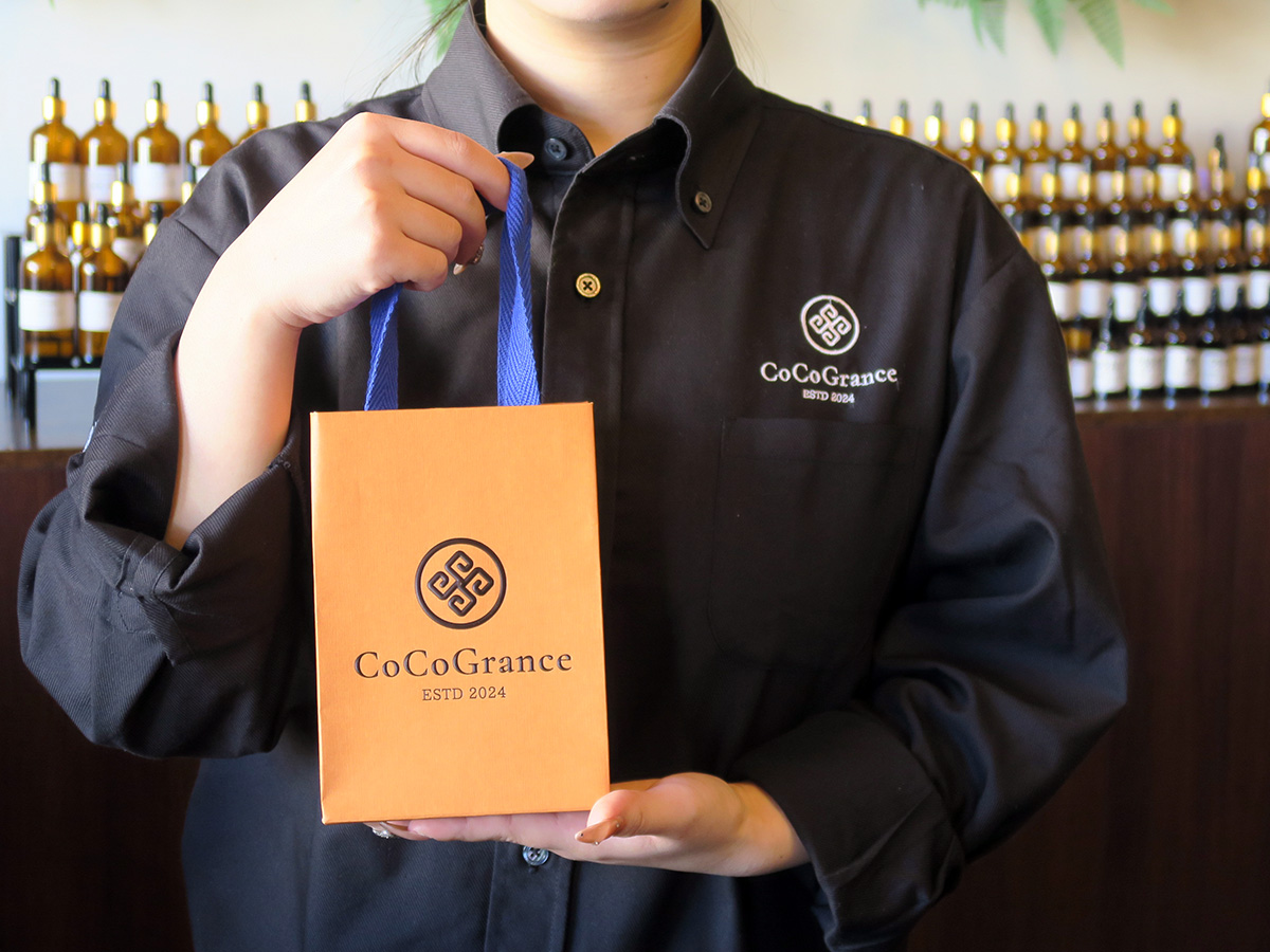 今月は、フレグランスサロン CoCoGrance様のショッパー&巾着袋をご紹介します。世界に一つだけのオリジナルフレグランスをつくるオーダーメイド調香体験ができるお店です。